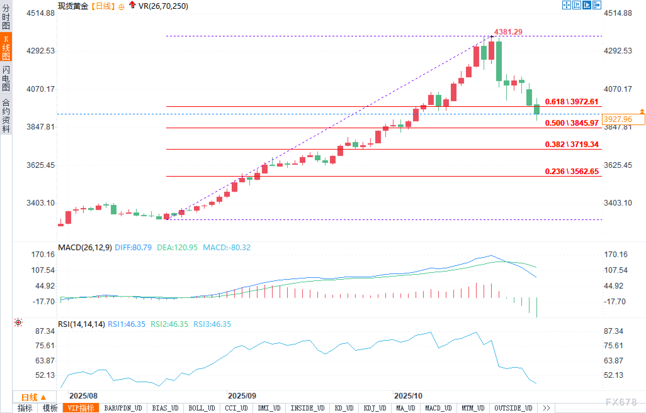 从现货黄金日线图来看,行情从前低约3403美元一线一路沿着上升通道拉升至4381.29美元高点,随后出现快速回撤,目前回踩至3920美元附近。图上已经画出了斐波那契回撤位:0.618回撤对应3972.61美元,0.500回撤对应3845.97美元,0.382回撤对应3719.34美元,0.236回撤对应3562.65美元。从结构上讲,金价现已跌破0.618回撤位附近的上方区间,但仍高于0.500回撤位,也就是3845.97美元这一更关键的中轴支撑。这意味着本轮下跌,尚未破坏整个上升趋势的核心骨架,行情仍处在典型的“高位回测—寻找新支撑”的阶段,而非彻底转成长期下降趋势。