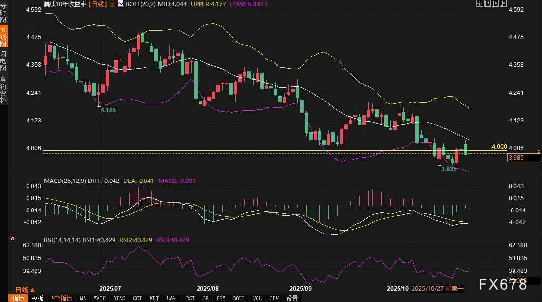 周二(10月28日),现货黄金延续回调态势,跌破4000美元心理关口,最低触及3886美元/盎司,随后小幅回升至3922美元附近。自10月20日触及历史高点4381.29美元后,该品种已累计下挫逾10%,日内波动加剧却未能逆转颓势。与此同时,美元指数维持在98.6880附近,近期在98至99.5区间窄幅盘整,与黄金的急跌形成鲜明对比,凸显非美元因素主导当下行情。10年期美债收益率则经历过山车式波动,周一一度重返4%上方,但迅速回落至3.985%,昨日收盘已低至3.982%。这一微妙转折反映出市场在美联储FOMC会议前夕的观望情绪,美债作为避险资产的吸引力再度浮现。整体而言,本周伊始,风险偏好回暖与政策预期交织,推动资金在黄金与美债间轮动,短期内或将围绕关键技术位展开拉锯。