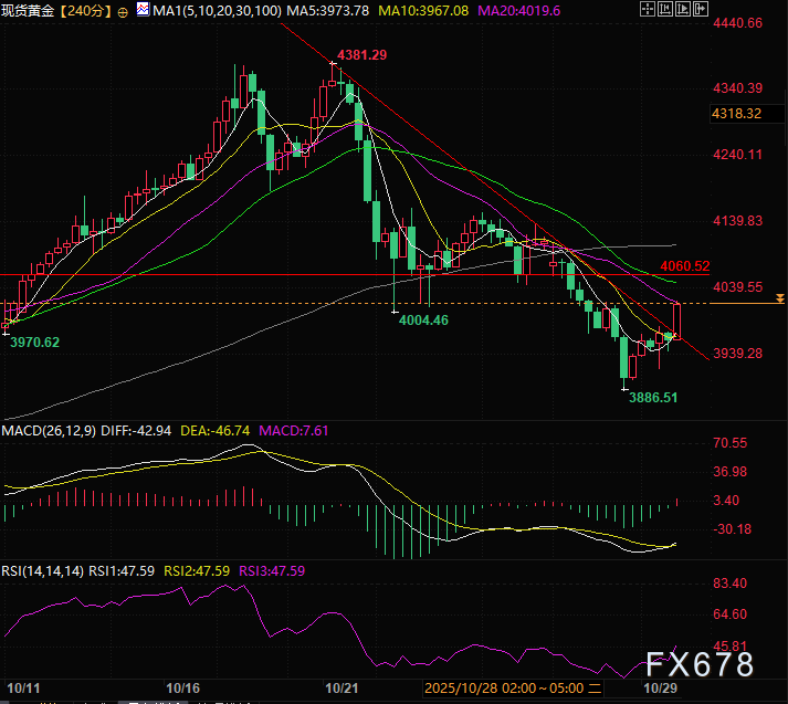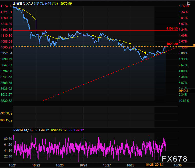 周三(10月29日)亚欧时段现货黄金小幅探底后展开反弹攀升至4000美元心理关口,目前涨1.83%,交投于4025.34附近。此前连续三日的下跌走势暂告终结——前一交易日金价曾触及逾三周低点。市场对美联储今日晚些时候下调借贷成本、且12月再度降息的预期持续升温,推动资金流向无息资产黄金。