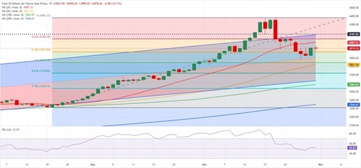 下行方面,根据Sengezer,在跌破短期支撑3970美元/盎司(8月至10月涨势的38.2%斐波那契回撤位)后,金价下一个支撑在3900美元/盎司(上升通道的中点,整数关口),接下来是3850-3820美元/盎司(50%斐波那契回撤位,50日均线)。