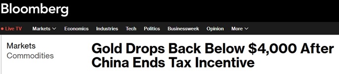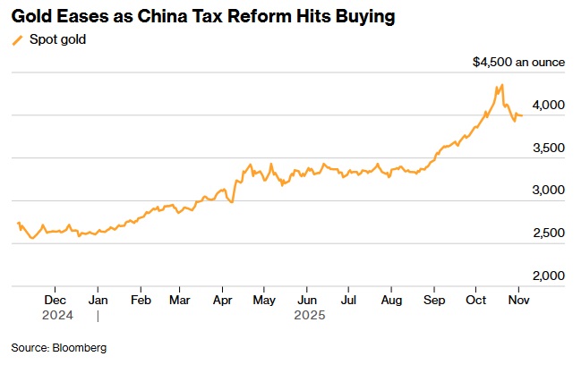 24K99讯 美国彭博社周一(11月3日)报道称,中国取消了对部分零售商的长期退税政策后,金价跌破4000美元/盎司;这一变化可能会损害这个最大的贵金属市场之一的需求。
