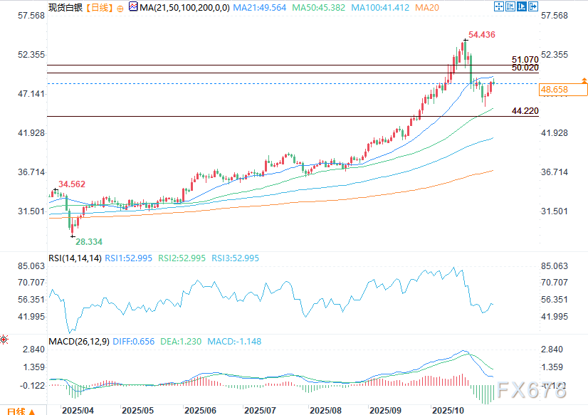 现货白银在周五收盘前转跌,早盘一度冲高至49.34美元后涨势消退,该价位略低于10月23日的震荡高点49.46美元。此次上涨遇阻表明卖方仍在打压反弹,目前来看,本周从45.38美元低点开启的回升更像是调整而非反转。北京时间周六02:00,现货白银报48.628美元,跌幅0.53%。