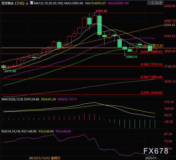 周三(11月5日)亚欧时段,现货黄金展开反弹,走出冲高小幅回落的走势盘中一度涨至3986约1.4%,目前交投于3958附近涨0.66%。
