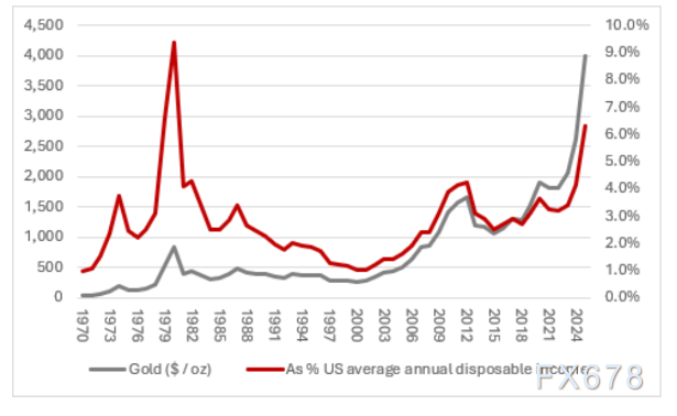 “从这一维度来看,当前近6.5%的比例表明,黄金价格或许仍有上行空间,尤其是若通胀开始回升,并通过加薪或资产价格上涨带动收入增长的话。”