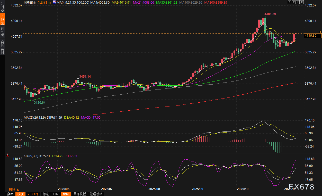周二(11月11日)亚市早盘,现货黄金延续隔夜涨势,一度触及4120关口,刷新近两周高点。周一现货黄金大涨2.85%,收报4115美元附近,这是自10月23日以来的最高收盘价。现货白银更是不甘示弱,涨幅超过4%,创下10月21日以来最高水平。在美国经济数据疲软与美联储降息预期升温的双重推动下,黄金作为非孳息资产的避险魅力全面爆发。