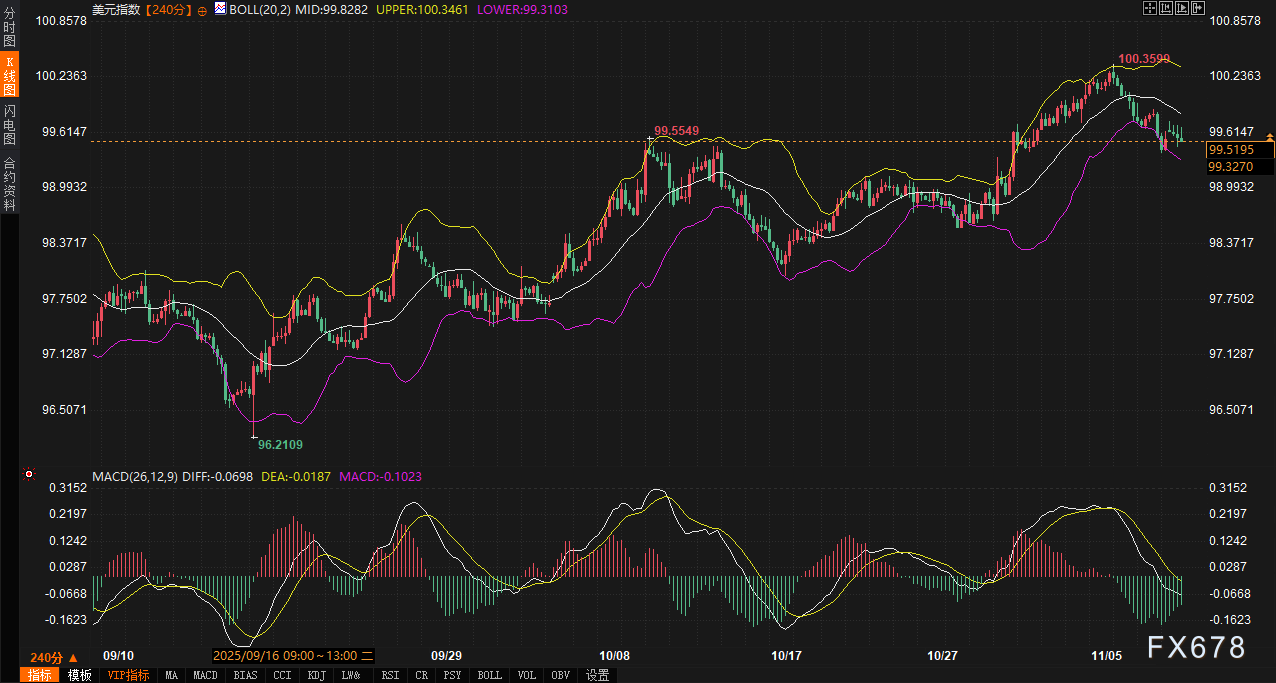 技术面与基本面相互印证。收益率在布林带下轨4.132%处形成关键支撑,若政治消息继续积极,可能推动收益率向中轨4.139%回升。若MACD快慢线形成金叉,收益率或进一步测试上轨4.146%,强化债市的鹰派信号。反之,若谈判拖延,下轨破位可能导致收益率回落至4.120%附近,但鉴于成交活跃,回调空间有限。总体来看,美债收益率的调整反映了政治事件的即时影响,并为美元走势提供了线索——收益率上行可能通过利差渠道压制美元吸引力。