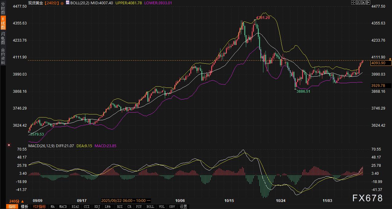周一(11月10日)晚间,全球金融市场出现结构性分化。随着美国国会参议院推进政府关门危机的解决方案,市场风险情绪改善,固定收益市场则面临压力。现货黄金作为避险资产,在债市波动中表现出韧性。美元指数微跌0.02%至99.5283,10年期美债收益率上升0.85%至4.132,现货黄金上涨2.31%至4093.84美元/盎司。这一格局反映了美国政治不确定性的初步缓解,以及中东地缘风险(如加沙人质交换提议)带来的微妙影响。整体市场情绪从谨慎转向温和乐观,但债市变化已开始影响汇率和贵金属的短期走势。