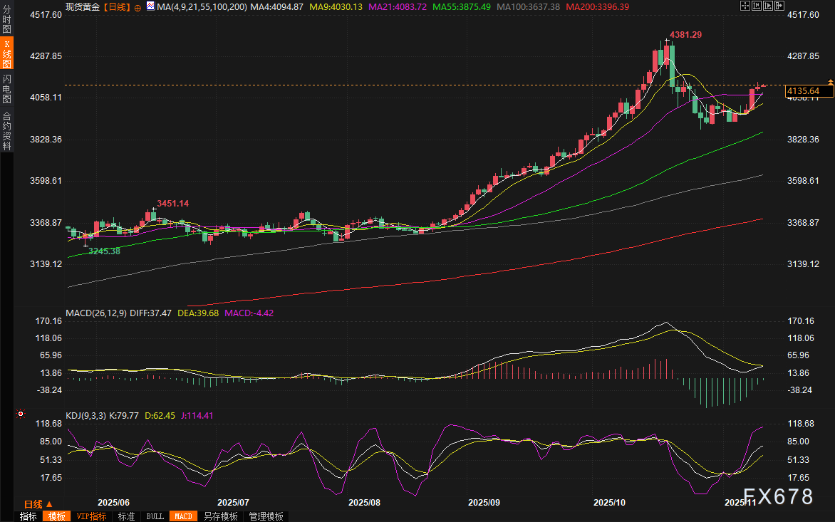 周三(11月12日)亚市早盘,现货黄金震荡微涨,目前交投于4135美元/盎司附近,守住了前几个交易日涨幅。金价周二上涨0.27%,收报4126.62美元/盎司,盘中最高触及4148.91美元,创下10月23日以来新高,美国政府停摆即将结束、经济数据恢复在即、以及美联储内部鹰派转鸽的明确信号,共同点燃了黄金市场的多头火焰。