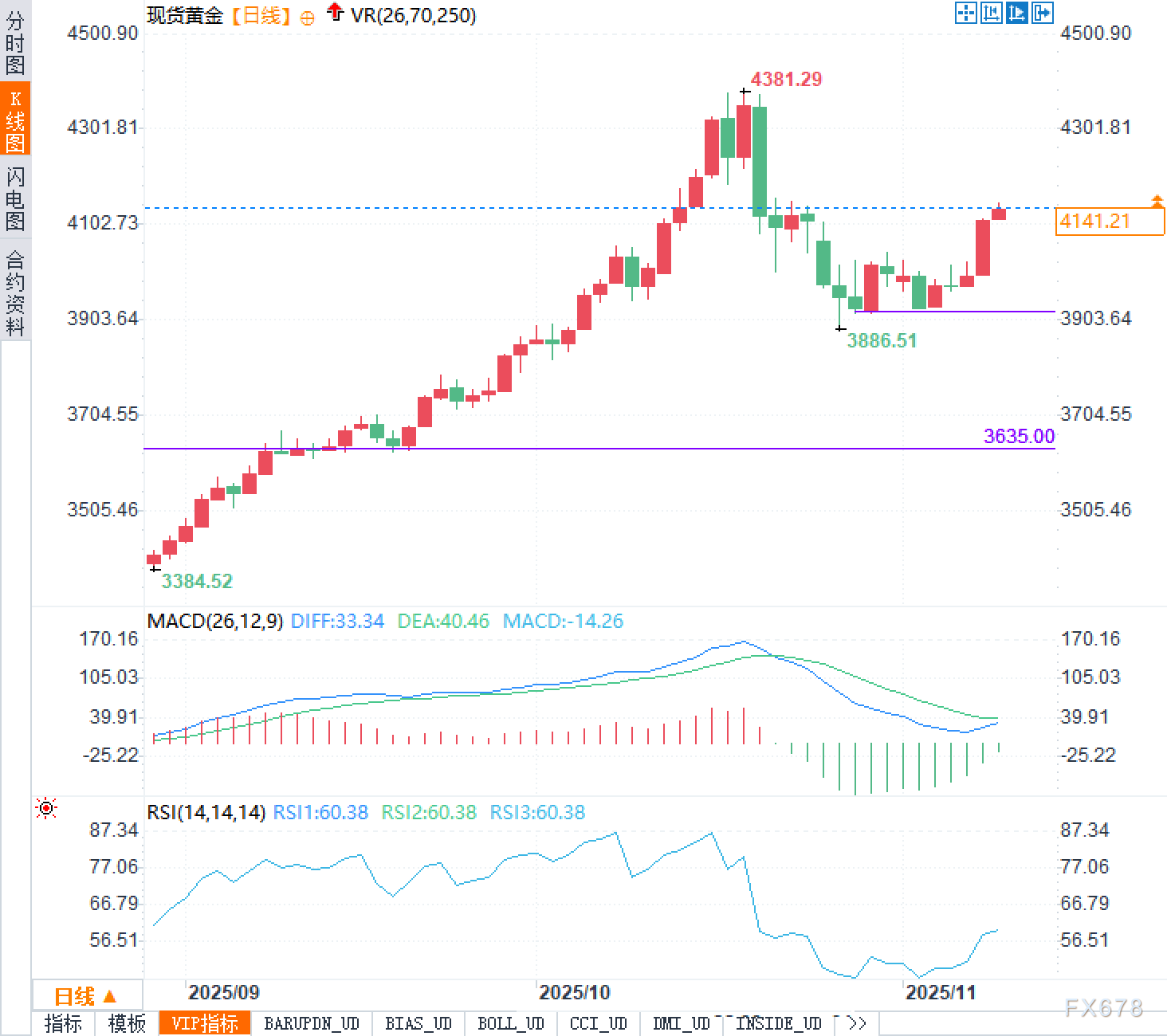 日线观测,前期自4381.29见顶回撤至3886.51,近期连阳修复,价格重返4100上方,处于9—11月升势后的技术性回抽阶段。MACD两线仍在零轴上方但DIF低于DEA,柱体负值收窄,显示下行动能减弱、修复未完。