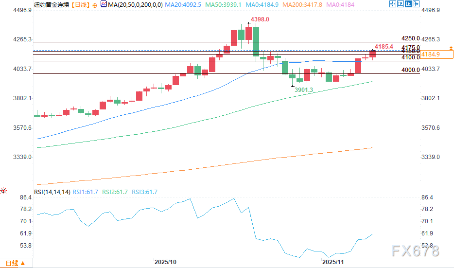 技术面来看,12月黄金期货多头的下一个上行价格目标是收盘价突破4250.00美元的强劲阻力位。空头的短期下行价格目标是将期货价格推至4000.00美元的强劲技术支撑位下方。第一阻力位见于4175.00美元,随后是4200.00美元;第一支撑位见于隔夜低点4104.40美元,随后是4100.00美元。