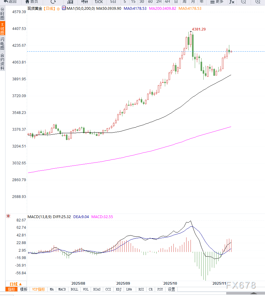 从日线结构来看,黄金持续运行在上升趋势通道内,且价格稳定在多条关键均线之上。其中,K线形态显示金价正尝试巩固4150–4200美元区间的支撑带。