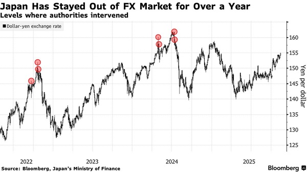 去年日元兑美元汇率跌至160.17附近时,日本财务省出手干预,并在157.99、161.76和159.45附近进行了额外干预。官员们表示,他们更关注汇率的波动性和走势速度,而非具体的汇率水平。