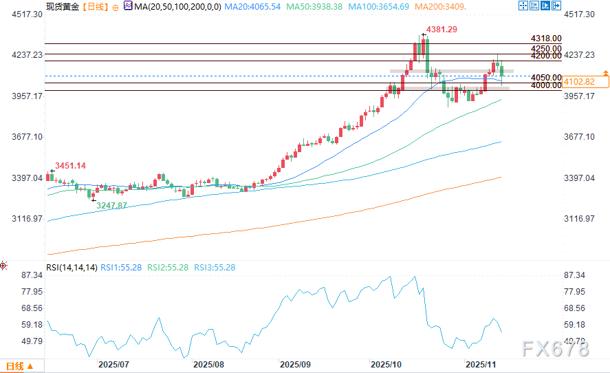 周五(11月14日)美盘时段,市场情绪喜忧参半,多头难以守住早盘涨幅,现货黄金遭遇大幅抛售压力。金价报4109美元左右,当日跌幅约1.5%,在从周四触及的三周高点4245美元回落之后,抹去了本周录得的大部分涨幅。