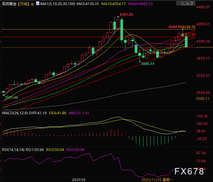 周五(11月14日)亚欧时段,黄金近期从三周高位开始回调,市场今天出现了奇怪的现象,美元指数和黄金一起下跌。现货黄金周五震荡走低,多头未能守住早盘上行动能,多空博弈加剧、情绪呈现明显分化。截至发稿,现货黄金交投于4053美元/盎司附近,较周四触及的三周高点4245美元显著回落。