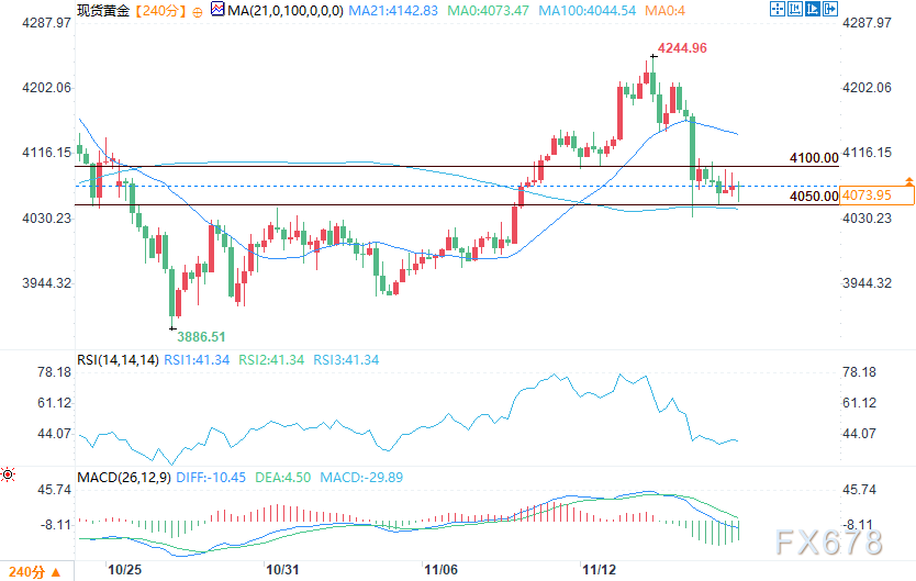 黄金短期前景呈现区间震荡态势。4小时图显示,100期简单移动平均线(SMA)附近(约4043美元)反复出现支撑,该水平同时接近此前整理区间的上沿,进一步强化了其作为强劲支撑位的重要性。