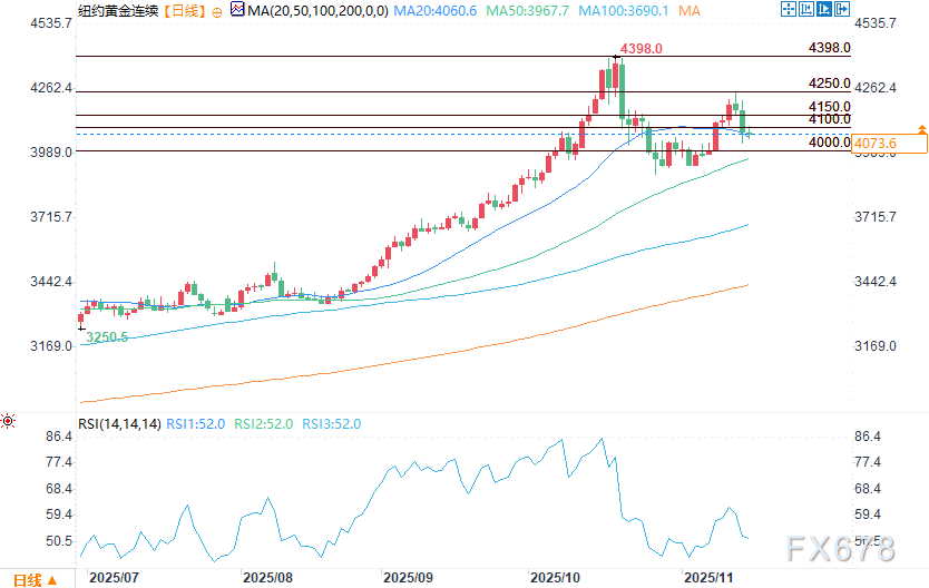 技术面来看,12月黄金期货多头的下一个上行目标是收盘价突破关键阻力位——历史高点4398.00美元/盎司;空头的近期下行目标是推动期货价格跌破关键技术支撑位4000.00美元/盎司。初步阻力位见于隔夜高点4107.60美元/盎司,随后是4150.00美元/盎司;初步支撑位为隔夜低点4051.10美元/盎司,接着是上周五低点4032.60美元/盎司。