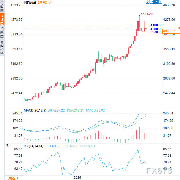 目前黄金是否仍处于这个阶段性调整阶段尚待观察,但未来走势很大程度上将取决于金价的下一步动向——是会在上周五下跌后快速反弹,还是持续承压。若是后者,金价可能继续下探4000美元附近的下一支撑位。若失守3930美元支撑,则看跌态势将进一步确立。
