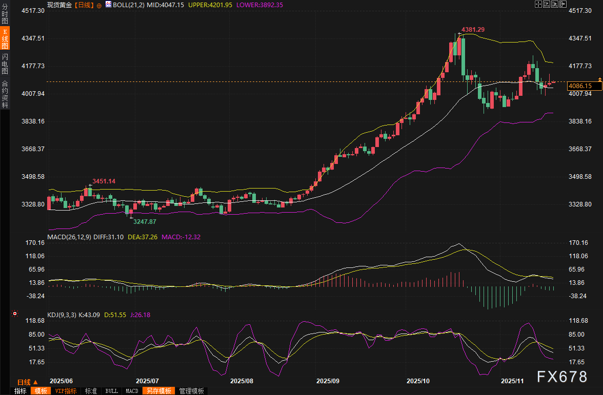 周四(11月20日)亚市早盘,现货黄金震荡微涨,目前交投于4088美元/盎司附近。周三金价冲高回落,早盘一度狂飙1.6%,最高摸至4132.66美元/盎司,可随着美元指数延续涨势,市场像被泼了一盆冷水,金价快速回落,美联储会议纪要偏向鹰派,美元指数刷新近两周高点,继续打压黄金多头士气,金价最终仅收涨0.25%,报4077.79美元/盎司。本交易日市场目光将转向美国9月份非农就业报告。