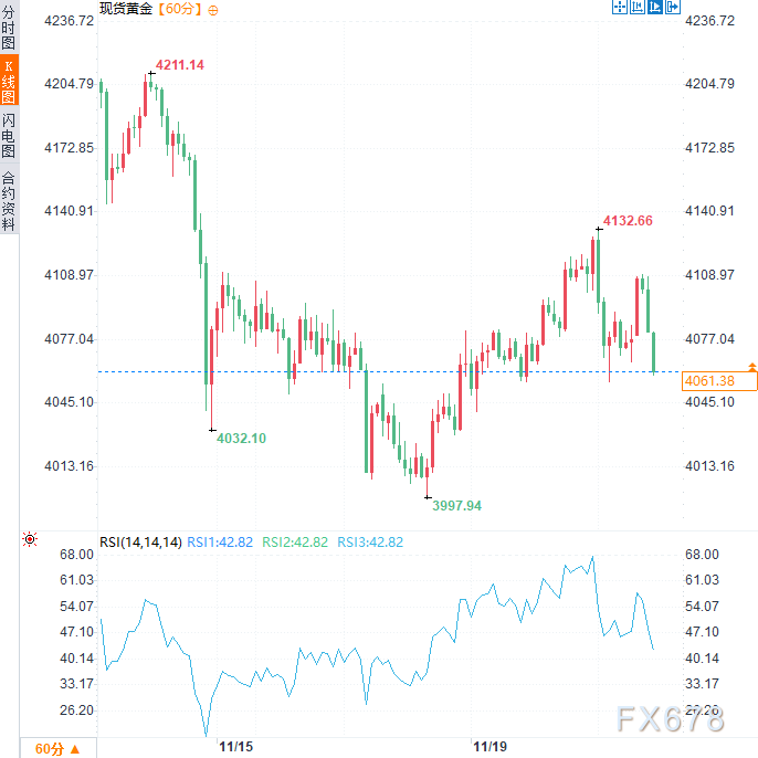 周四(11月20日)现货黄金一度涨至每盎司4110.03美元,但随着美元强势上涨,黄金涨势遭遇重击,一度下跌约0.88%至每盎司4042美元附近。