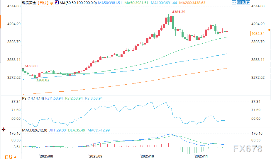 黄金涨势正在重启,但交易员需推动金价实现每日收盘价站上4100美元关口。若突破该水平,下一个目标位将是4150美元,随后将测试11月13日创下的上一轮周期高点4245美元。
