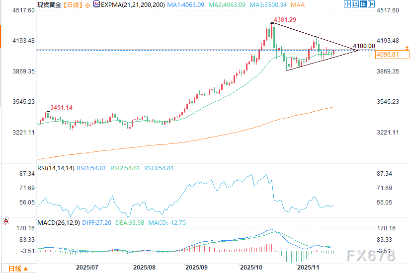 周一(11月24日)美盘时段,当前黄金日内走势呈现尾盘强势拉升、多头动能占优的状态。黄金价格盘中上涨0.81%,但缺乏实质动能支撑,能否实现更具意义的反弹仍有待观察。近期该贵金属持续横盘整理,在4000美元至4100美元区间内窄幅波动,区间振幅仅100美元。日线收盘价始终徘徊在该区间中上部区域,而较长的上下影线形态表明,多空双方均未形成主导市场的坚定信心。随着美元走势趋强、股市震荡波动、债券市场承压以及加密货币市场同样起伏不定,黄金展望仍受制于相互冲突的市场逆流。