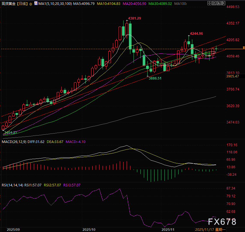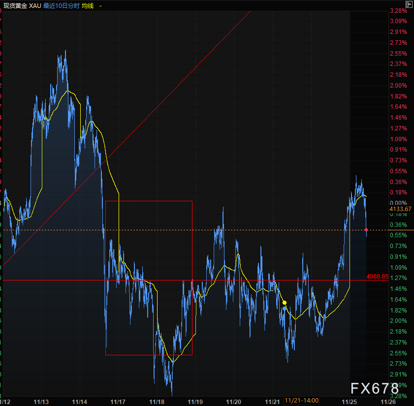 周二(11月25日)亚欧时段,现货黄金呈现小幅冲高回落加探底回升走势。日内黄金虽小幅上探逾一周高点涨0.6%左右,但未能有效承接涨势,上行延续性不足,盘中一度跌至-0.6%,目前跌幅收窄至-0.2%交投于4125美元附近。