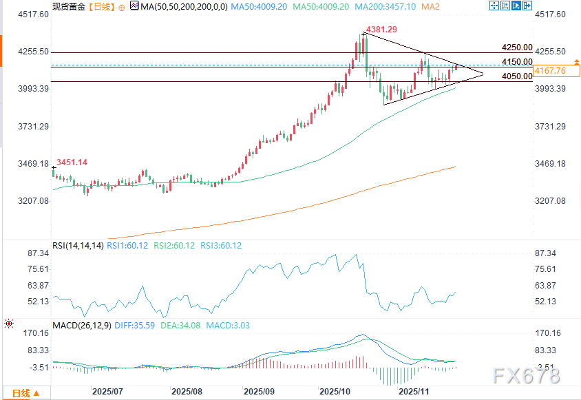 技术面来看,现货黄金日线图呈现对称三角形整理形态,目前正尝试突破上轨阻力。若突破成功,将进一步巩固牛市趋势,上行空间有望打开,后续目标看向4200美元及4250美元。
