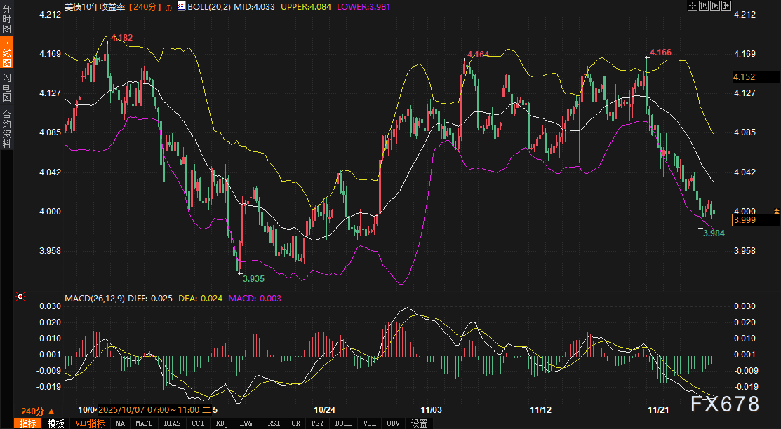 周三(11月26日)美国时段,美元指数微幅承压于99.72附近,日内跌幅0.09%,未能站稳100关口。10年期美债收益率在3.998%附近震荡,日内小幅上涨0.05%,但多次试探4%以下区间后遭遇卖压。现货黄金表现强劲,日内上涨0.77%,报4162.60美元/盎司,逼近近期高位。市场整体呈现“债市趋稳、美元疲软、黄金走强”的格局,反映出投资者在关键经济数据公布前的谨慎情绪。