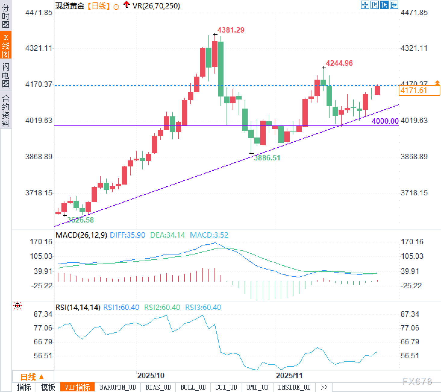 从图表来看,现货黄金的走势表现出一定的上涨趋势,目前价格在4170美元附近。首先,价格的波动呈现出明显的上升趋势,且价格已突破之前的高点(如图中的4244.96美元)。这表明市场情绪较为强势,但价格也逐渐接近可能的阻力区间,特别是在接近之前的高位时,市场可能会出现一定的震荡或调整。