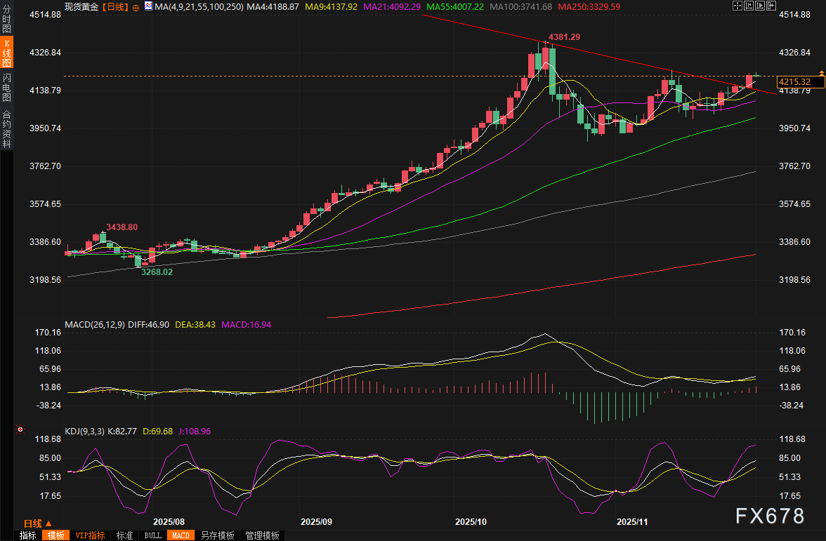 现货黄金在上周五(11月28日)强劲冲高,涨幅达到1.5%,触及两周新高4226.56美元/盎司,最终收报4219.20美元/盎司。从月线来看,金价11月上涨5.4%,这已经是连续第四个月的上涨,显示出市场对黄金的持续青睐。周一(12月1日)亚洲时段,现货黄金继续保持涨势,一度刷新高点至4230.41美元/盎司。这种连续上涨的格局并非偶然,而是受到了宏观经济环境和货币政策预期的双重支撑。投资者们将黄金视为对抗不确定性的盾牌,尤其是在经济增速放缓的预期下,黄金的不孳息特性变得格外吸引人。