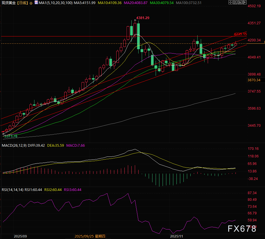 日线图中金价继续沿上升通道运行,支撑在5日线的4150附近和通道下轨4128附近。