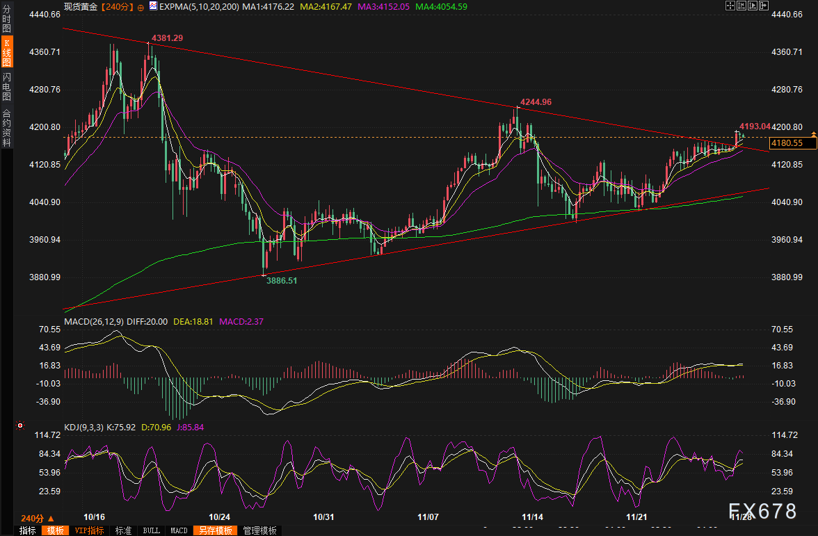 周五(11月28日),金价在亚洲时段一度冲高至两周高位,现货黄金最高触及4193美元附近,随后虽小幅回落,欧市盘初,金价窄幅震荡,但整体仍牢牢守住了前一日的绝大部分涨幅。目前现货黄金在4180美元附近高位震荡,距离4200美元整数心理大关仅一步之遥。市场多空双方正在此展开激烈争夺,一旦突破4200美元,黄金有望迎来新一轮爆炸式上涨。