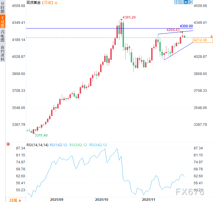 黄金技术分析仍呈积极态势,金价目前仍守住在4200美元这一重要关口。若价格能够突破下图所示形态,上涨动能有望进一步增强。