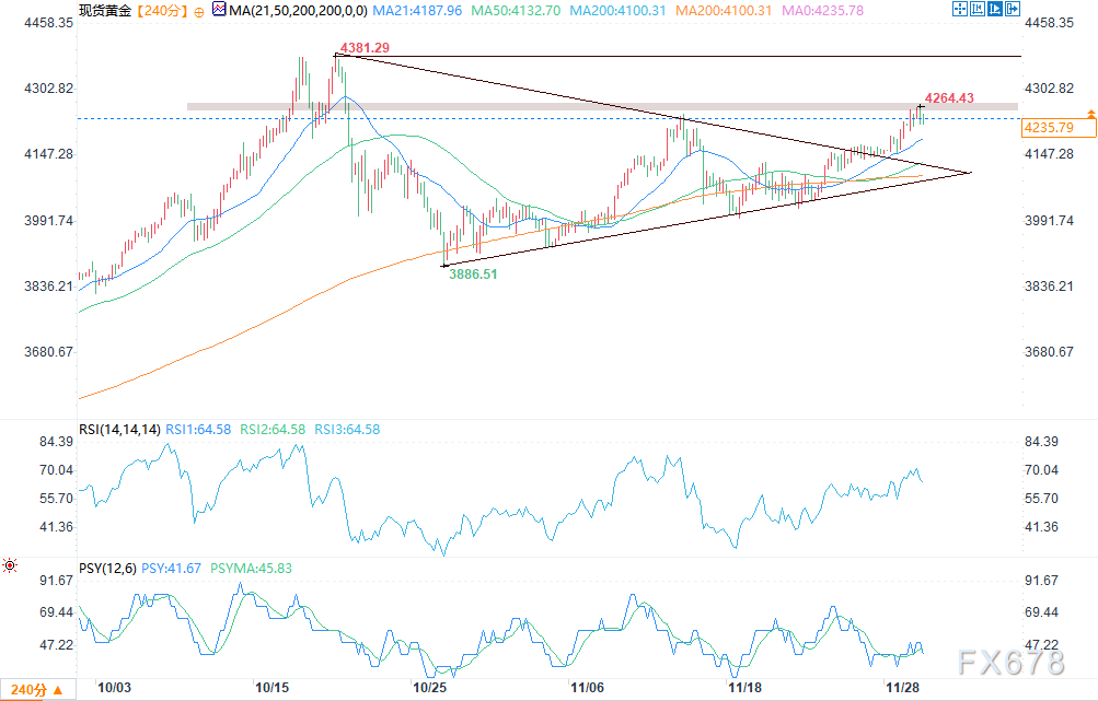 现货黄金本月开局表现强劲,周一攀升至10月21日以来的最高水平。避险情绪为避险买需提供支撑,同时交易员预计美联储(Fed)将在12月9日至10日的货币政策会议上再次降息。现货黄金盘中交投于4238.53美元/盎司附近,涨幅0.46%。