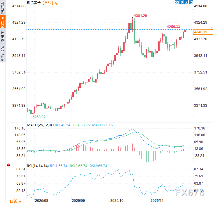 周一现货黄金连续第二个交易日走高,一度上涨0.88%,创下10月21日以来新高至4256.33美元/盎司。