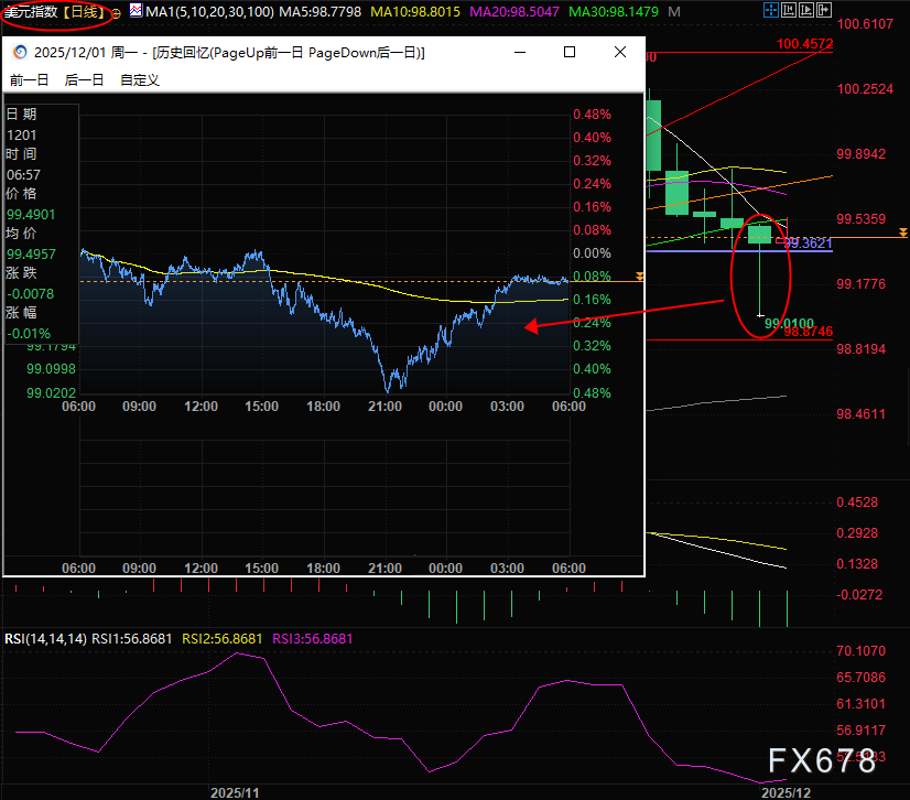 周二(12月2日)亚欧时段现货黄金展开回调,本次金价从4000美元/盎司开启了两周稳健反弹、触及4250附近后出现明显回落,目前交投于4200附近,美元指数的快速反弹是本次金价回调的直接原因,而导火索则是日债带头抛售引发的美债收益率上升。