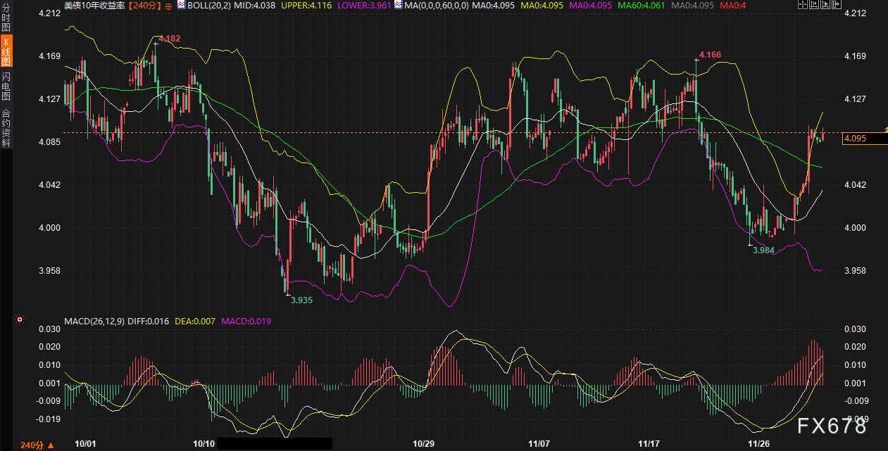 从技术面审视,10年期美债收益率240分钟图呈现关键的区间震荡格局。布林带(参数20,2)显示,中轨位于4.038%,上轨与下轨分别构成4.116%和3.961%的边界。当前价格运行于中轨上方,但紧贴上轨阻力。MACD指标(参数26,12,9)的DIFF线与DEA线均为正值,但DIFF线(0.016)有下穿DEA线(0.007)的迹象,暗示短期上涨动能可能减弱,存在高位整理或回调的可能。