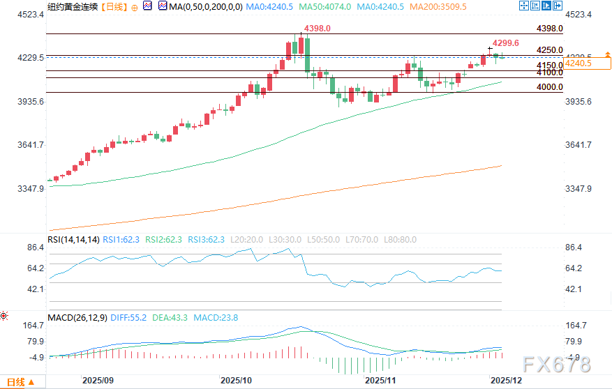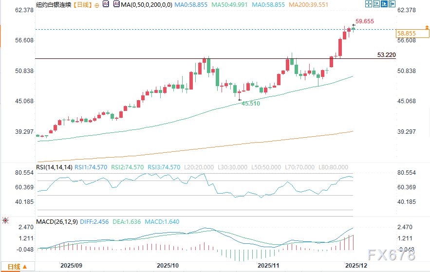 周三(12月3日),美国午盘交易时段,黄金和白银价格走高,其中白银再创历史新高,逼近每盎司60美元关口。在美国公布的一项经济数据弱于市场预期后,白银守住了隔夜涨幅,黄金则在小幅隔夜上涨的基础上进一步走高。周中时段,投机者的技术性买盘也十分活跃,两大市场的短期图表形态均呈强劲看涨态势。2月交割的黄金期货(高于现货金约40美元)盘中报每盎司4250.80美元,上涨30美元;3月交割的白银期货盘中报每盎司59.06美元,上涨0.347美元。
