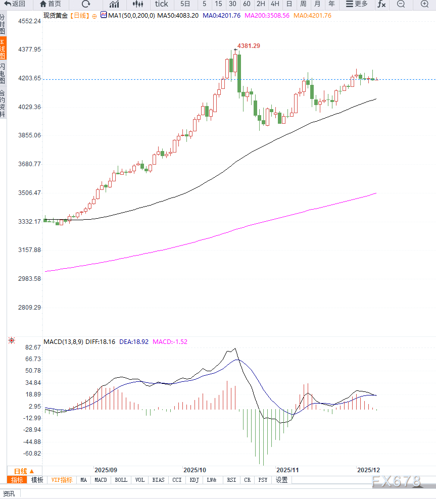 MACD动能柱虽有回落,但仍位于零轴上方,说明趋势结构未遭破坏。然而,上方在4215—4230美元区域存在明显压力带,K线多次冲高受阻,显示资金在等待美联储会议的进一步指引。