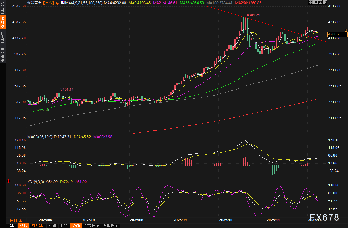 黄金市场在上周五(12月5日)呈现出典型的冲高回落走势,现货黄金一度飙升至4260美元/盎司关口附近,但随后快速转跌,尾盘收报4196.03美元/盎司,回落至4200美元关口下方。这种波动主要源于美联储降息预期的持续支撑与多重压力的交织。