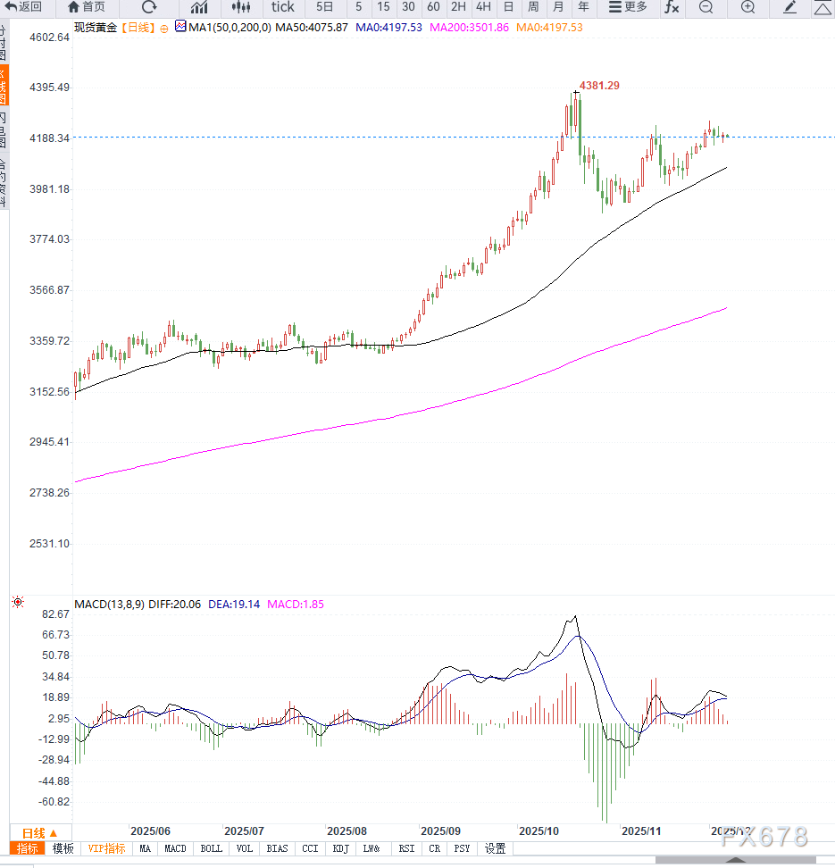 从日线级别观察,黄金在突破4200美元后进入高位横盘阶段,整体呈现短线强势整理、长线维持上行结构的走势特征。近期K线在短期均线附近频繁形成上下影线,显示多空力量在高位僵持,而5日与10日均线依旧维持上行斜率,确认中期多头趋势未被破坏。