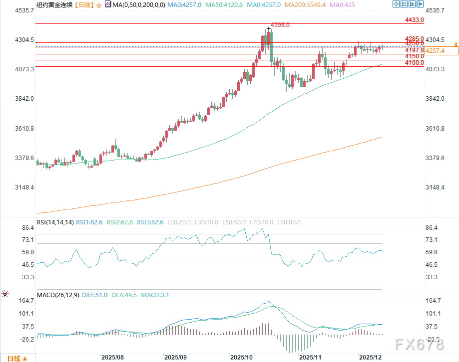 周四(12月11日),黄金价格在美国交易时段早盘表现坚挺。白银大幅走高,并在隔夜交易中再创历史新高。这两种贵金属正看到更多的技术性买盘,并受益于美联储出人意料的鸽派倾向(也有分析师解读为鹰派)。2月黄金期货(COMEX期货金价格一般高于现货金十几美元)盘中上涨20.40美元,至每盎司4,245.00美元。3月白银期货价格上涨1.446美元,至每盎司62.47美元。