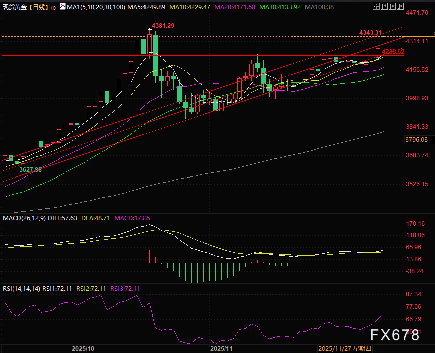 周五(12月12日)本周美联储降息落地后,市场对后续进一步宽松政策的预期持续升温,直接推动黄金(XAU/USD)延续强势上涨态势,美联储鸽派基调为金价提供了坚实的买盘支撑。目前交投于4337附近。