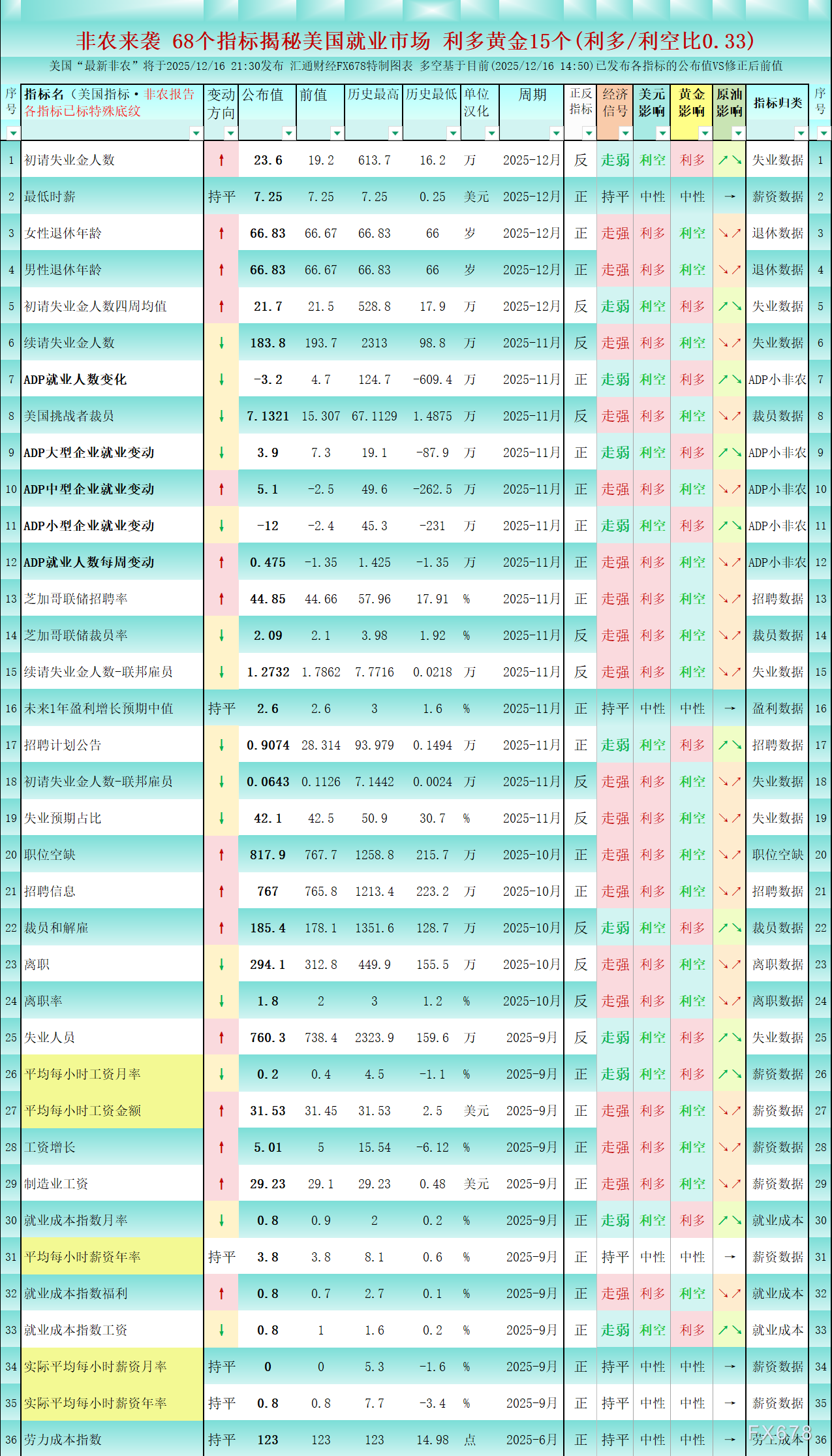 一张图:美国非农数据来袭 68个美国就业关联指标 利多黄金的仅15个。美国“最新非农”将于2025/12/16 21:30发布,市场密切关注。堪称金融市场必备打卡的美国非农”,将会如何影响市场?今晚即将揭晓。本文原创特制图表或可提前窥探一二。