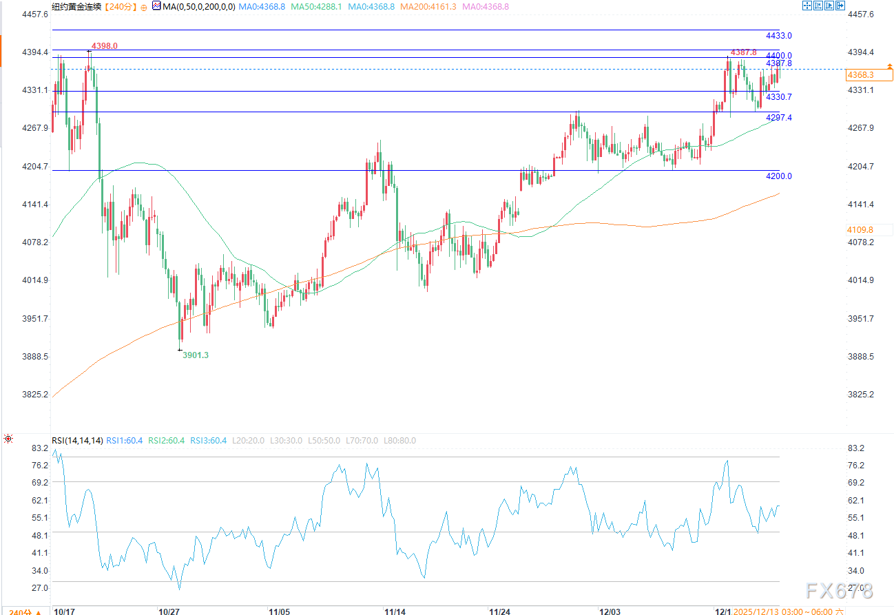 技术面来看,2月黄金期货多头的下一个上行目标是收盘价突破关键阻力位——合约历史高点每盎司4433.00美元;空头的近期下行目标是推动期货价格跌破关键技术支撑位每盎司4200.00美元。第一阻力位见于12月高点每盎司4387.80美元,其次是每盎司4400.00美元;第一支撑位见于今日低点每盎司4330.70美元,其次是本周低点每盎司4297.40美元。