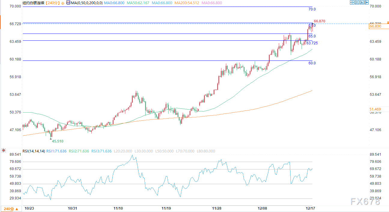 周三(12月17日)美国东部时间午盘交易中,金价小幅走高,银价则大幅上涨,3月纽约商品交易所(Comex)白银期货触及每盎司66.87美元的历史新高。周中时段,避险需求与技术性买盘成为支撑这两种金属价格的主要因素。2月黄金期货(一般高于现货金十几美元)最新报每盎司4368.1美元,上涨35.8美元;3月白银期货报每盎司66.715美元,上涨3.392美元。