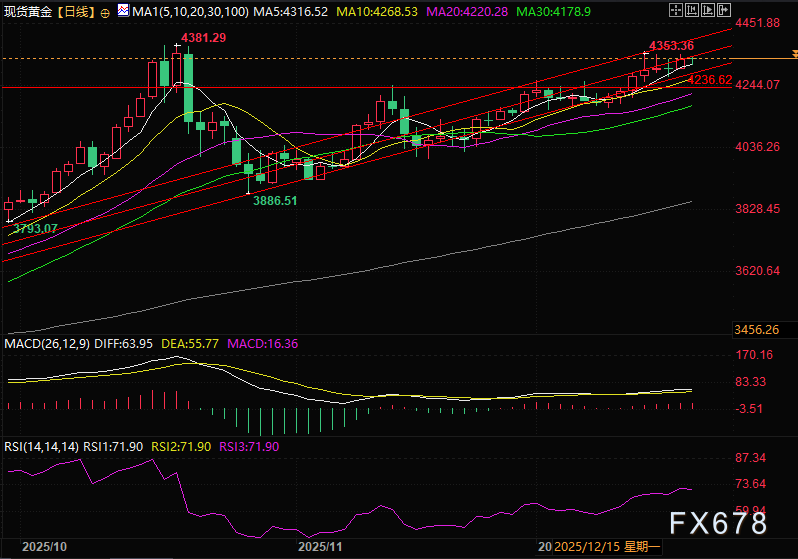 技术面来看,现货黄金兑美元(XAU/USD)仍维持完好的多头结构,但当前正于4350美元阻力区间下方横盘整理,如果盘中跌破5日线则有走弱的迹象,如果收盘在5日线之下则走弱概率变大。