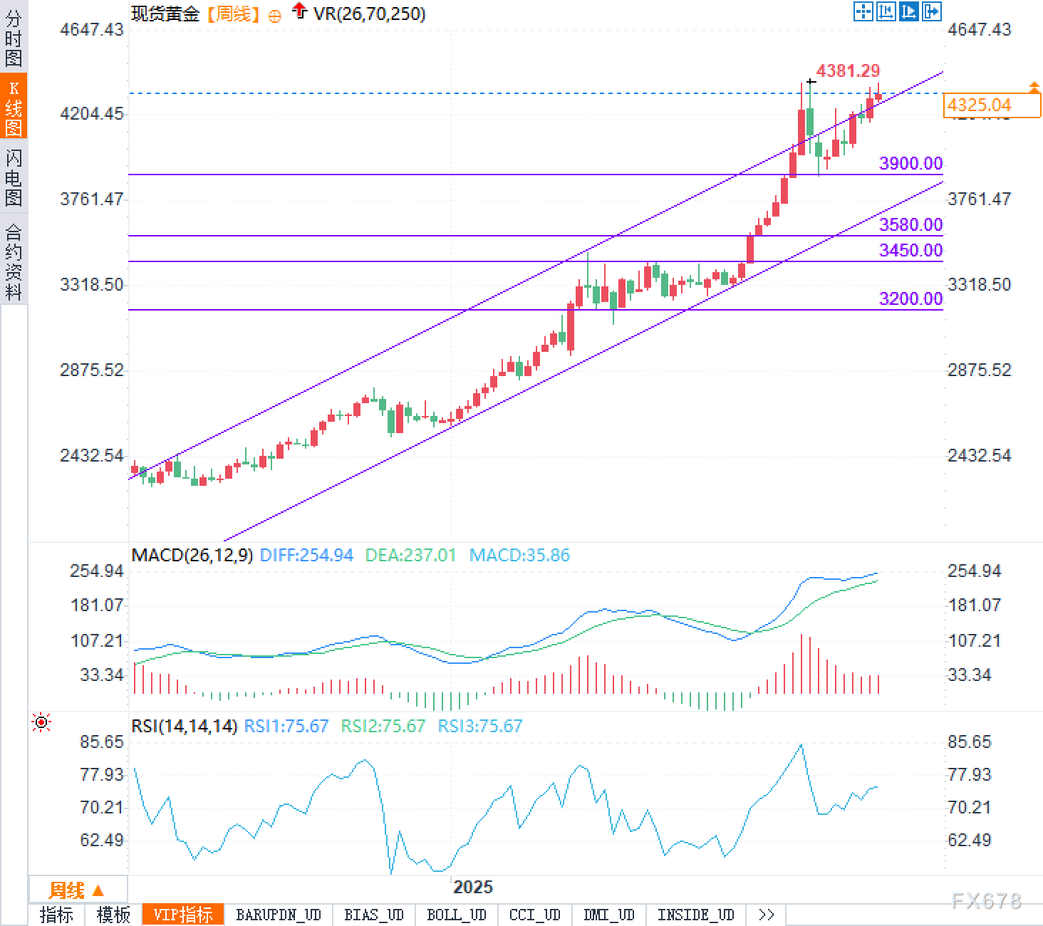 从技术图形来看,现货黄金仍处于明显的多头格局之中。周线级别价格运行在一条持续14个月的上升通道上方,整体结构健康。然而,相对强弱指标(RSI)已长时间位于70以上,明确提示市场处于超买状态。这并不意味着趋势即将反转,而是说明短期内需要一次降温或修复,来释放过热压力。