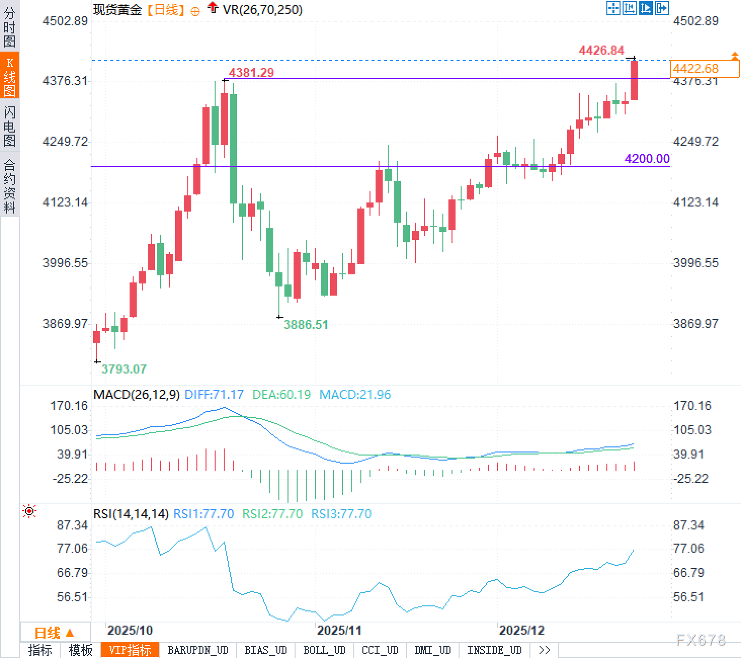 周一(12月22日),现货黄金延续强势,北美时段交投4420美元附近,仍处于历史高位区间。此前价格有效突破4400美元心理关口,并继续上探至4426.84美元一线。强趋势叠加年末流动性趋薄,使得行情更容易在短时间内放大波动,短线既可能延续拉升,也更容易出现获利了结式回撤。