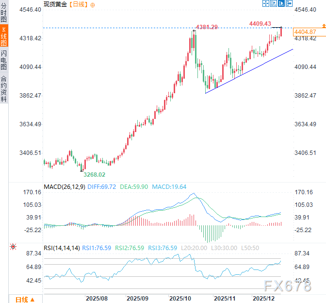 尽管周一(12月22日)市场交投清淡,现货黄金价格仍刷新历史纪录高位,一度触及4409.43美元/盎司,进一步印证了其长期看涨趋势的强劲势头,涨幅约1.51%。